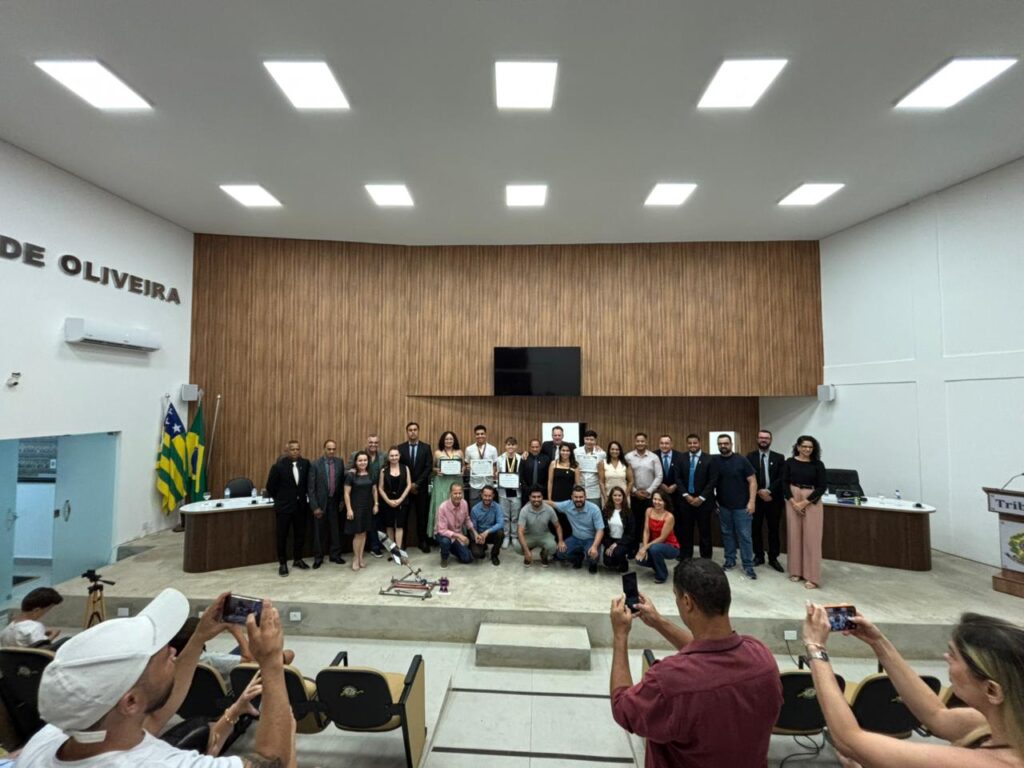 Na noite desta quarta-feira, dia 03 de dezembro de 2025, a Câmara Municipal de Guapó realizou a entrega de Moção de Aplausos aos alunos conterrâneos do IF Goiano – Campus Trindade, que se destacaram por projetos de grande relevância acadêmica e social. A homenagem reconhece o esforço, o talento e a dedicação dos estudantes, que vêm elevando o nome de Guapó por meio da pesquisa e da inovação.